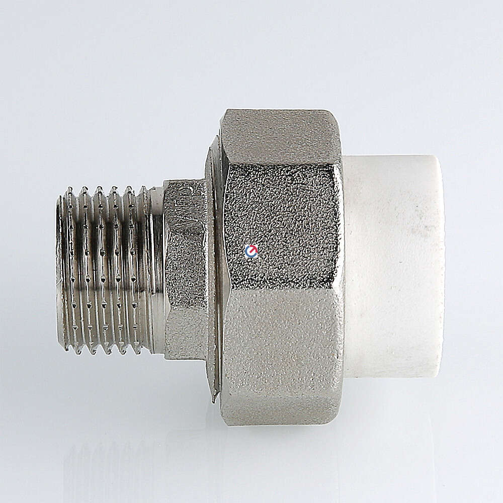 (VTp.761.0) Полипропиленовый фитинг для создания разъемного, с использованием накидной гайки, соединения полипропиленового трубопровода с трубопроводом или арматурой из других материалов. Уплотнительное кольцо выполнено из синтетического каучука EPDM. Резьба фитинга – наружная трубная по ГОСТу 6357.