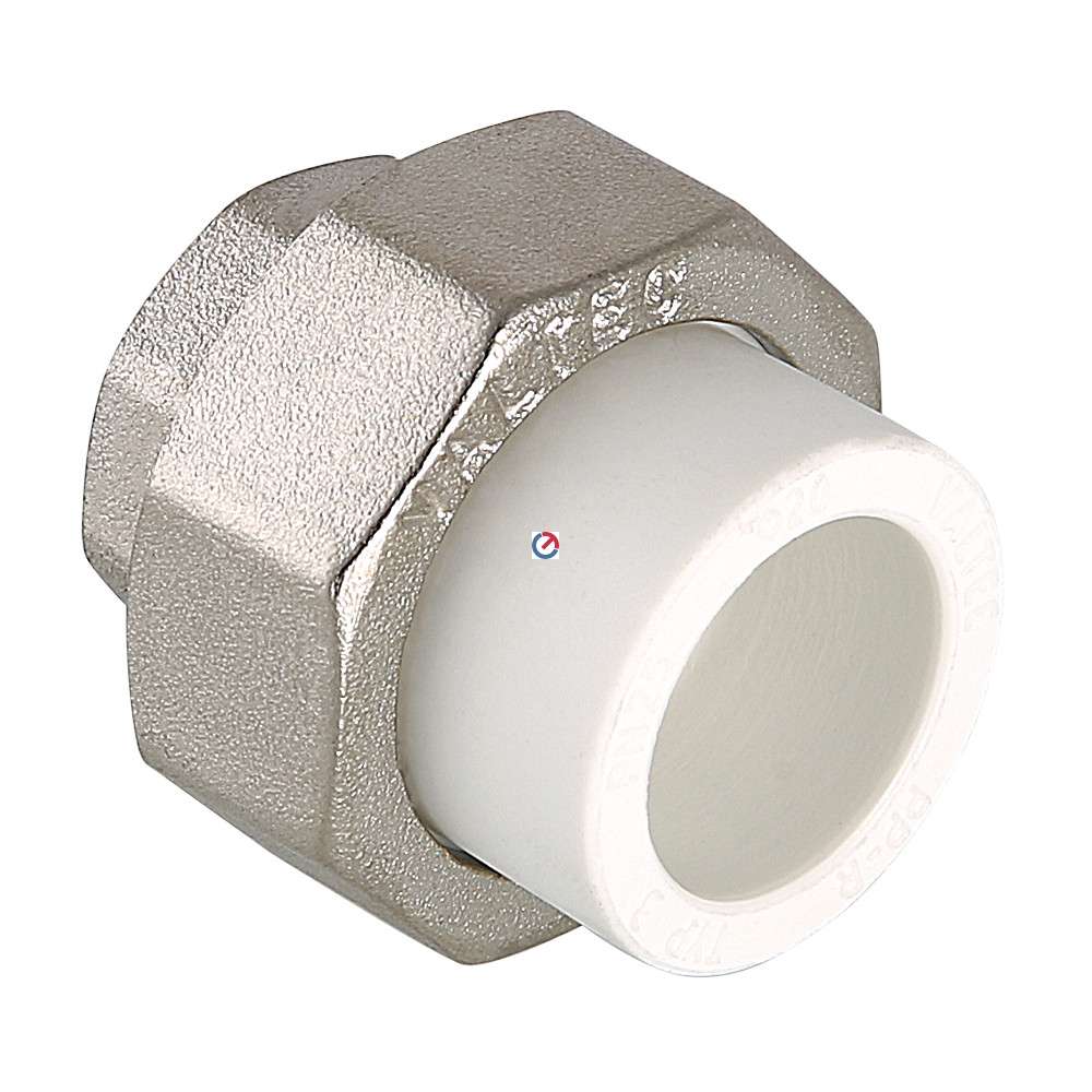 Разъёмный полипропиленовый фитинг с переходом на внутреннюю резьбу обеспечивает соединение полипропиленовых трубопроводов с элементами из иных материалов, гарантируя при этом возможность многократной сборки и разборки узла. Разъёмный элемент используется при обустройстве инженерных систем: от бытовых сетей холодного и горячего водоснабжения до отопительных контуров и систем «тёплый пол». Корпус изготовлен из полипропилена, резьбовая вставка из латуни никелированная. Резьба трубного типа по ГОСТ 6357-81. Фитинг рассчитан на эксплуатацию при максимальном давлении 2,5 МПа и температурой рабочей среды не выше 95°C. Компенсационное кольцо изготовлено из эластичного синтетического каучука.