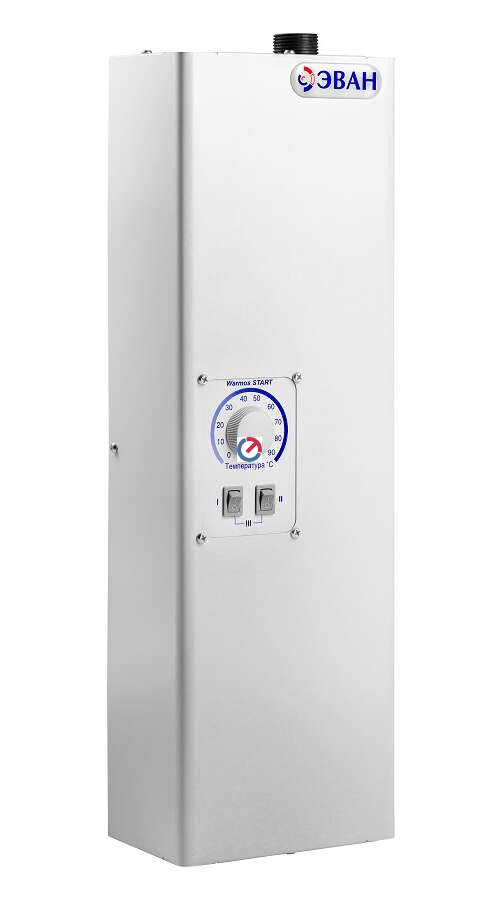 Отопительный электрокотел ЭВАН Warmos Start 5 мощностью 5 кВт - компактное и эффективное решение для автономного обогрева помещений площадью до 50 квадратных метров, например, квартиры или небольшого загородного дома. Устройство работает от стандартной однофазной сети 220 В, что упрощает его установку без необходимости прокладки мощной трехфазной линии.