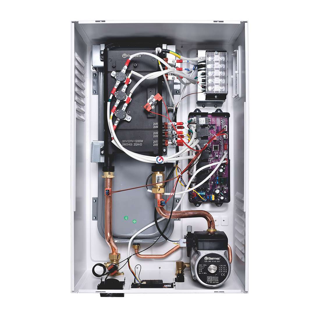 Подключение к электрической сети - однофазное (220 В) и трёхфазное (380 В).Надёжные ключевые компоненты: теплообменник сухого нагрева из алюминиево‐магниевого сплава. Материал устойчив к коррозии и термическим нагрузкам, а конструкция предотвращает образование накипи.
