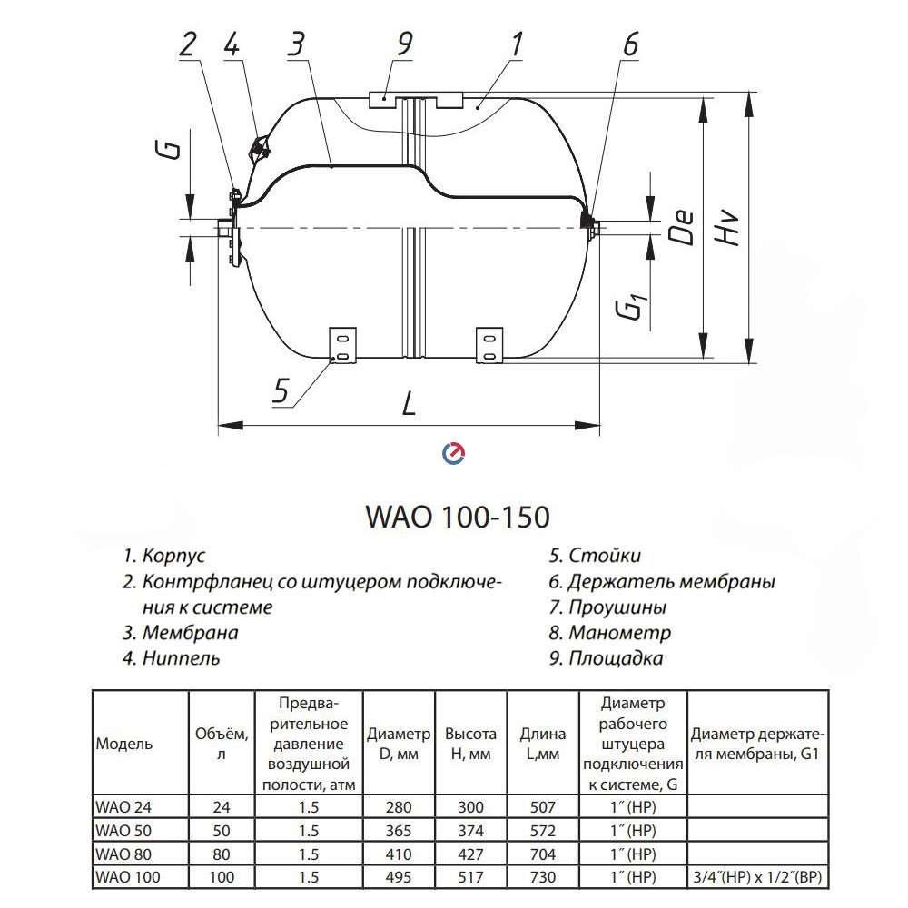 Гидропневматические мембранные баки для систем ГВС и холодного водоснабжения (автоклавы или гидроаккумуляторы). Предназначены для компенсации гидроударов, поддержания постоянного давления, уменьшения количества включений-выключений насоса. Мембрана из бутилового каучука разделяет водяную и воздушную полости. Модели до 50 литров без опор.