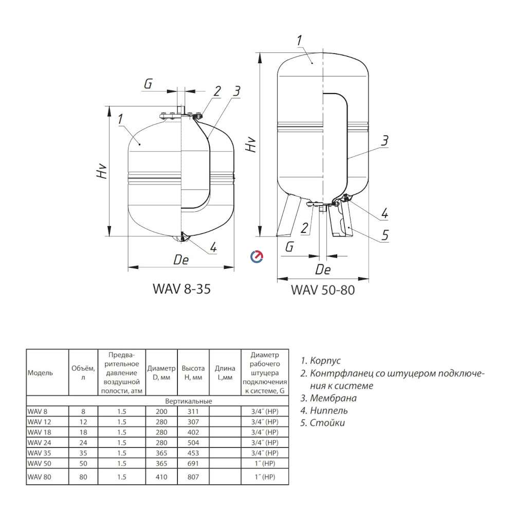 Гидропневматические мембранные баки для систем ГВС и холодного водоснабжения (автоклавы или гидроаккумуляторы). Предназначены для компенсации гидроударов, поддержания постоянного давления, уменьшения количества включений-выключений насоса. Мембрана из бутилового каучука разделяет водяную и воздушную полости.