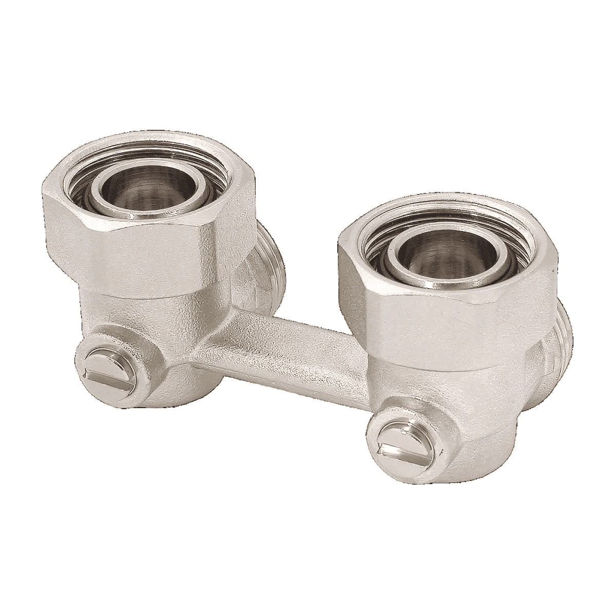 Узел предназначен для нижнего подключения отопительных приборов при подводе теплоносителя из стены, с присоединительными патрубками с меж осевым расстоянием 50 мм. Клапан снабжен шаровыми затворами для перекрытия потока.