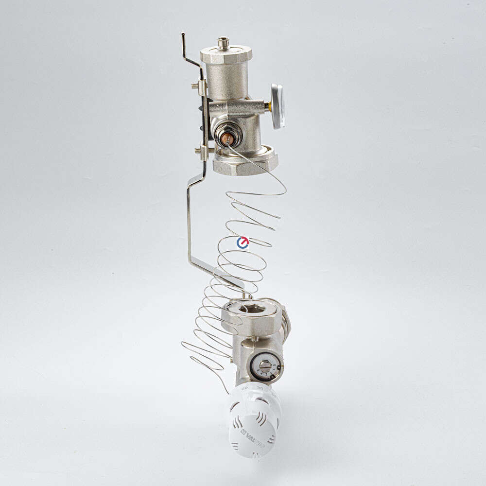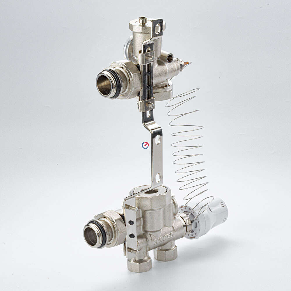 Верхний и нижний блоки узла и его компоненты изготовлены из латуни марки CW617N. Конструкция включает в себя воздухоотводчик автоматический, смесительный и термостатический клапан с термоголовкой, термометр.