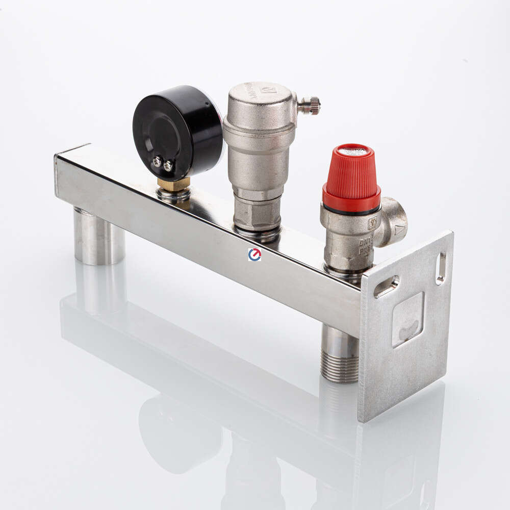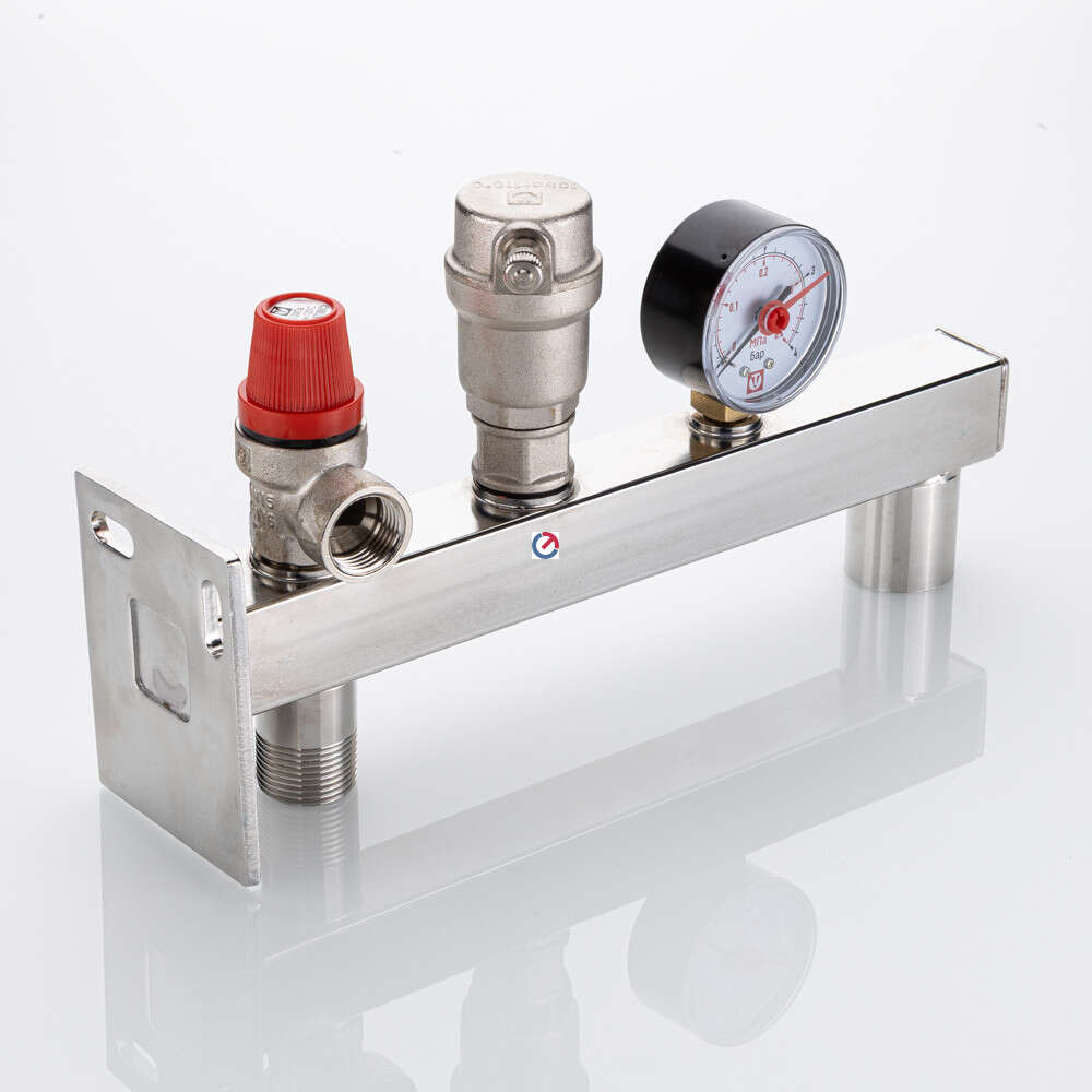 В состав группы входят: предохранительный клапан, автоматический воздухоотводчик и манометр с диапазоном шкалы от 0 до 4 бар. Давление настройки системы составляет 3 бар.