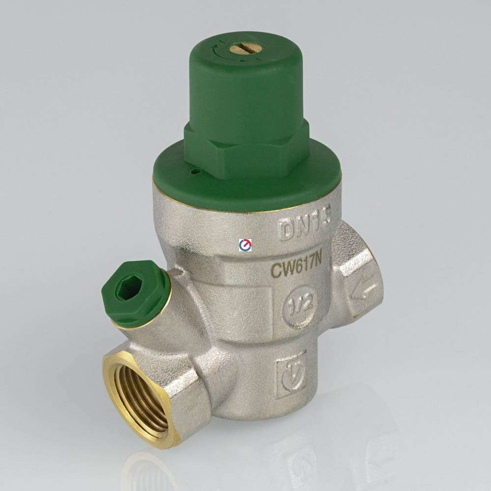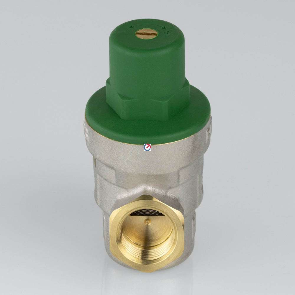 Редуктор давления предназначен для снижения давления рабочей среды в сетях холодного и горячего водоснабжения, водяного отопления, а также на технологических трубопроводах. Редуктор снижает давление "после себя", поддерживая давление на выходе не выше настроечного. Диапазон регулировки давления 1–5 бар, заводская преднастройка 3 бар. Предусмотрена возможность подключения к редуктору манометра, патрубок с наружной резьбой 1/4", закрытый резьбовой пробкой. Корпус изготовлен из никелированной латуни, пружина редуктора - из нержавеющей стали, уплотнительные кольца EPDM. Корпус картриджа изготовлен из нейлона, что позволяет использовать редуктор на жёсткой воде, т.к. этот материал устойчив к минеральным отложениям. При необходимости замены картриджа, может быть установлена новая деталь VTs.089.N. Диапазон допустимой температуры рабочей среды – 0–80 °С.
